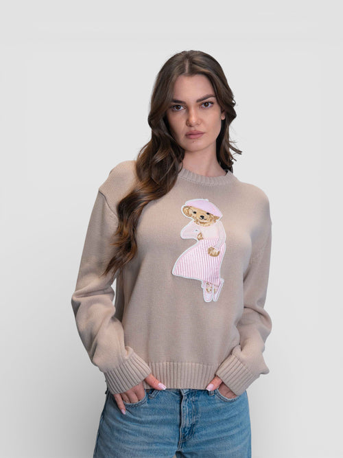 Бежов пуловер с апликация на мече